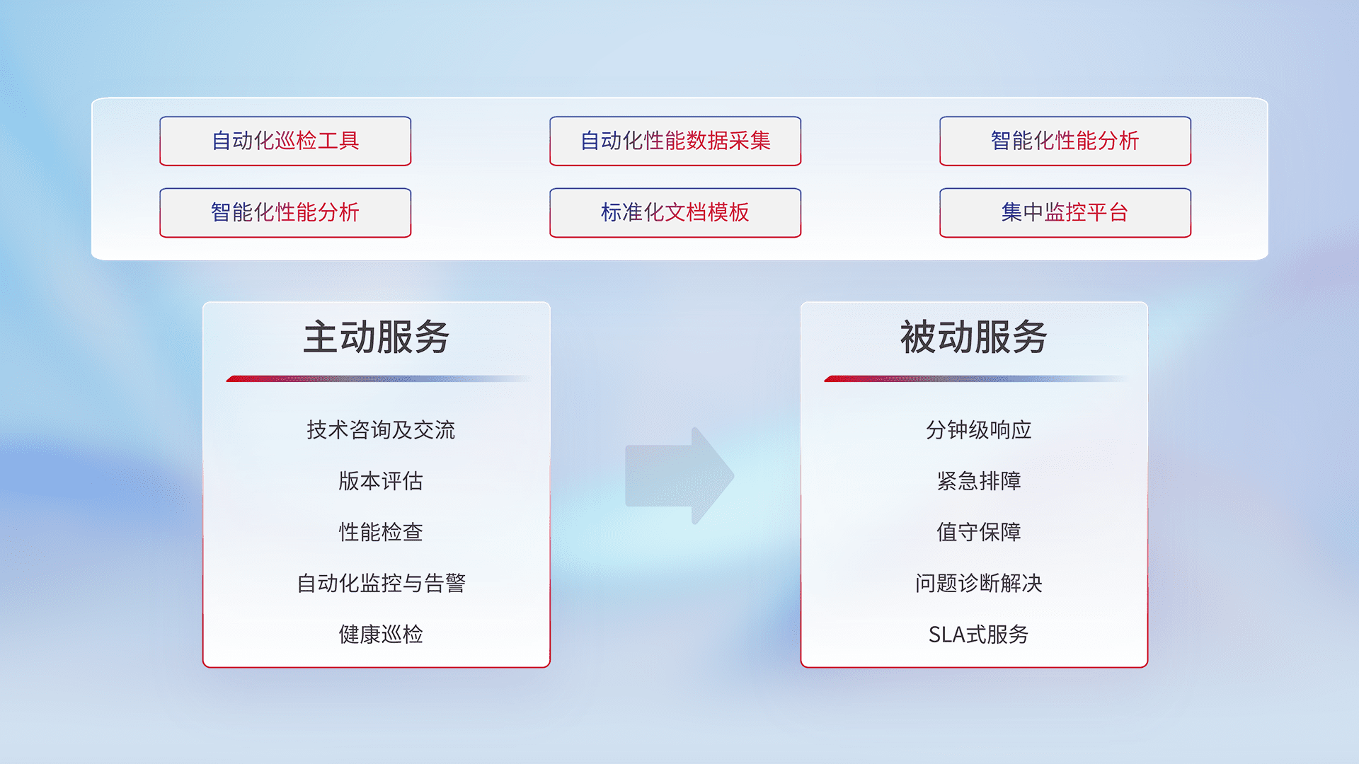 智能化工具和标准化文档,,保障服务质量,,,提供主动服务(包含技术咨询、、、、版本评估、、、、性能检查、、、自动化监控与告警、、健康巡检)和被动服务包含(分钟级响应、、、紧急排障、、、、值守保障、、、问题诊断解决、、、、SLA服务)。。。。